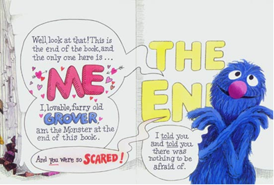 Fans of Grover and the gang could catch him away from the telly as well—as I did, with messianic zeal. He featured in a series of well-known books based on his character, the most famous of which was called The Monster at the End of This Book, starring Lovable, Furry Old Grover. Afraid because he doesn’t like monsters (ironically, since he himself is a monster), he implores the reader not to turn each page, which would bring us closer to the monster: “YOU TURNED THE PAGE! Maybe you do not understand. You see, turning pages will bring us to the end of this book, and there is a Monster at the end of this book…” He spends the book trying to prevent the reader from turning each page,