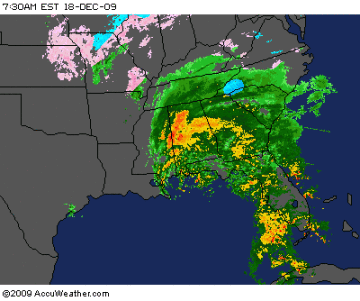Caveat: storms like this are notoriously difficult to predict, since we’re depending on the low to bomb out off the coast and drive the moisture into our area. A shift of 20-30 miles in track could affect the snow totals—and who gets hit—significantly. Here’s a look at the impressive area of moisture as it churns through the south…