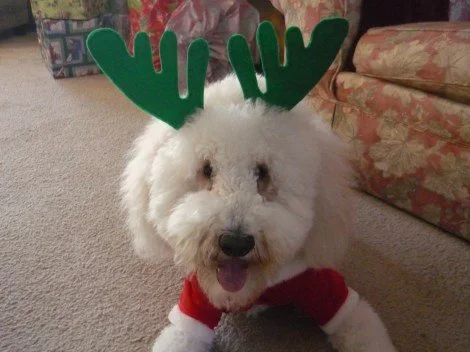 In honor of the 16-month anniversary of The Bunk's birth (and the eve of Christmas Day), we decided to create some memorable photos involving the dog, a Santa outfit, and a reindeer headband. In the course of this photo shoot there was much laughter, commotion, confusion, repeated commands, frantic hand gestures, and biting of the wardrobe items. But finally we came up with a couple of really sweet shots of long-suffering Bunk in his holiday finery. Also included is a shot of The Bunk frolicking in the snow following last weekend's Nor'easter. Please to enjoy.