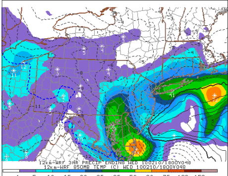 But here, my snow-besieged friends, is where it really gets fun. By mid-morning on Wednesday, the northwest winds will crank up, reaching their height (sustained winds in the 20-25mph range, gusting past 40mph) on Wednesday afternoon and evening. What these near-blizzard conditions portend for us is blowing, drifting, extremely poor visibility, and power outages—not to mention wind chills plunging into the lower teens—right when we’re trying to clean up this mess. This wind—plus the dumping of a foot of snow on top of the foot and a half most of us got just a few days ago—may extend delays and cancellations in Thursday.