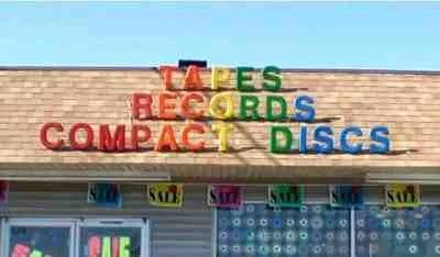 The first thing you may notice about the store—and one of the reasons for its notoriety among residents of this area—is its rainbow-colored sign composed of large letters mounted above the overhang, advertising that it sells “TAPES RECORDS COMPACT DISCS.” But as the picture below clearly illustrates, the letters are arrayed—and their colors chosen—in a peculiar manner. Specifically, the only three yellow letters, when read top to bottom, spell out “P-O-T.”