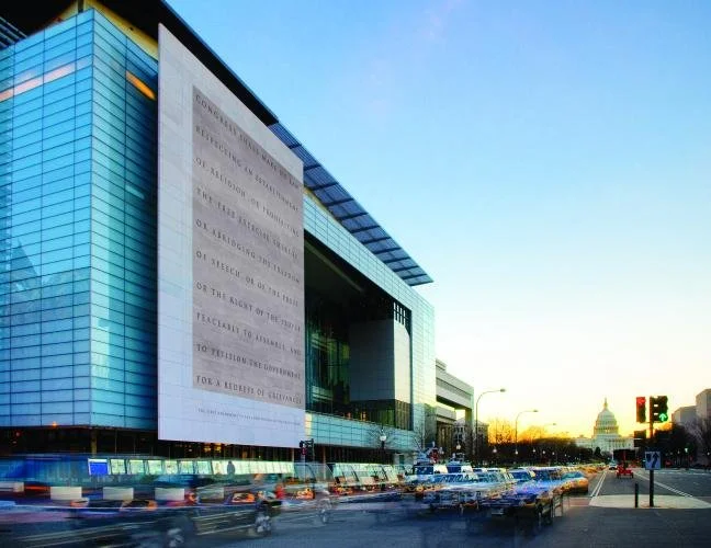 Into the façade of the Newseum is etched the so-called Establishment Clause from the First Amendment, and the length of the building is lined with the current front pages of newspapers around the country and (on the sixth floor) world.