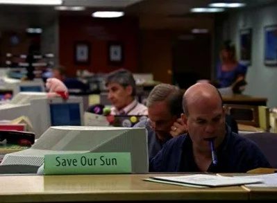 Then managing editor Thomas Klebanow (David Kostabile) is thrown to the wolves by Whiting as he reads a prepared statement and fields their questions. He talks about a “voluntary separation plan”—a euphemistic way of saying “buyouts” that is laughably antiseptic in tone. Under a VSS (voluntary separation scheme), the corporate entity eliminates the positions of those who “volunteer” to take buyouts, saving the company lots of money in the long run. Essentially, veteran workers are “voluntarily” separated from their jobs, the jobs themselves are separated from the newsroom, and the newspaper is separated more and more from the quality on which it once prided itself. Some employees will be “moving on to other opportunities beyond The Sun.” Aside from the celestial implications of such a move, this is another euphemistic way of saying that there will be firings.