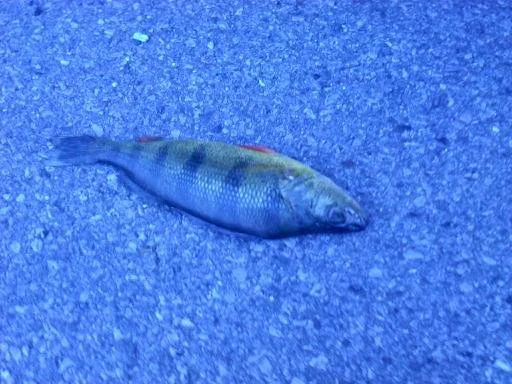 The creature in question. It is a perch, according to friends, and it is delicious when prepared with a little bit of butter and lemon. This one, not so appetizing.The aforementioned fish guts and scales. Difficult to see, but I promise they're there.