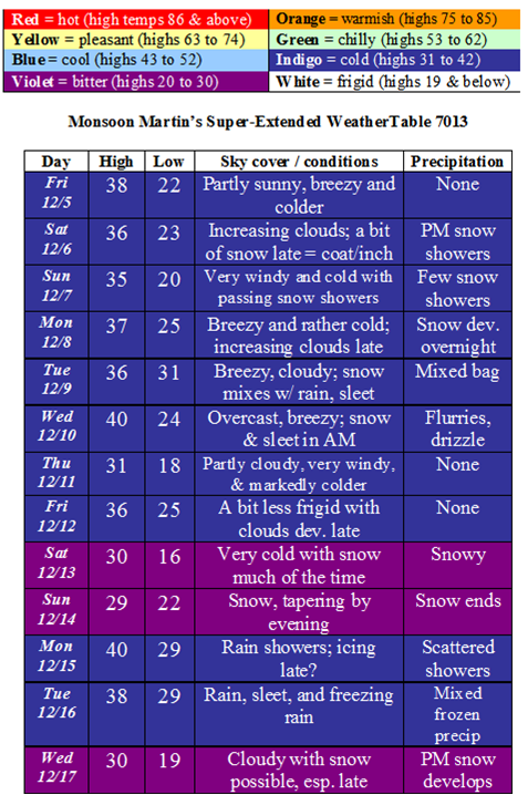 Friday 12/5: sunny with increasing clouds late. High 36, low 21.