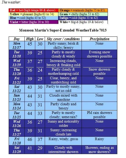 Weather narrative: This week will be unseasonably cold as temperatures will not even make it out of the 30s for most of the week, and snow showers (with no appreciable accumulation) may pop up Tuesday or Thursday evening.(Average highs for this time of year are in the low 50s; lows are in the low to mid 30s.)