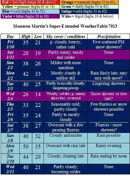 Sunday 1/11 – partly cloudy and breezy. High 28, low 15.