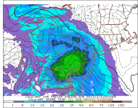 Caveat: storms like this are notoriously difficult to predict, since we’re depending on the low to bomb out off the coast and drive the moisture into our area. A shift of 20-30 miles in track could affect the snow totals—and who gets hit—significantly. Here’s a look at the impressive area of moisture as it churns through the south…