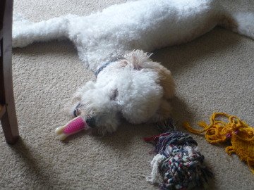 The Bunk lies surrounded by his toys, as is his wont; here he has actually fallen asleep while chewing on his bone