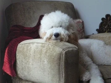 But contrary to my worst fears, Bunk’s powers of sweetness and devotion were not contained, Samson-like, in his hair; he’s been the lovingest, cuddlingest little four-legged companion a guy could ask for.And his hair is growing back in, so he’s got far more “poof” going on.
