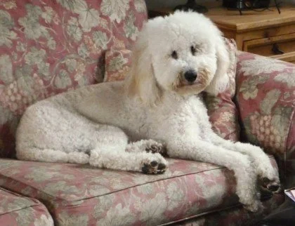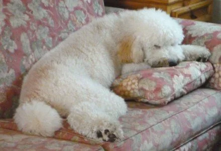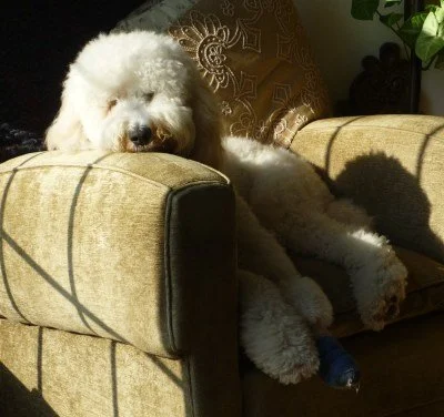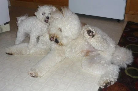 Over the past few months, The Bunk has acquired a cousin—a Bichon Frise puppy named Buttons, who was welcomed into the Spatz family. Buttons is a wily, diminutive bundle of naughtiness, and the two of them have taken quite well to hanging out together some days. The picture below is a fine illustration of the horseplay in which Bunk and Buttons typically indulge.