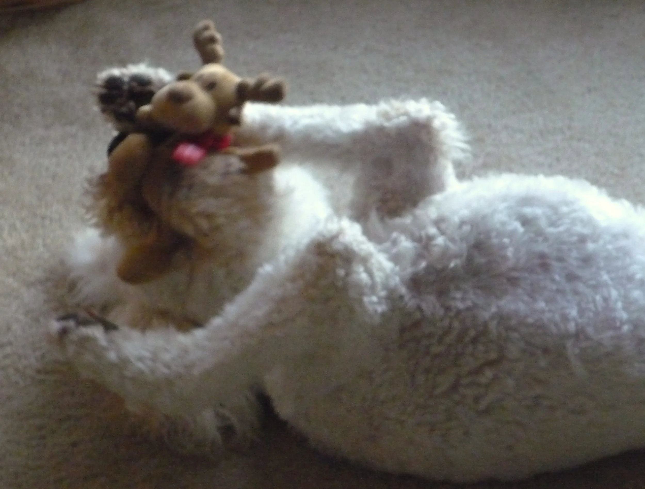 For the upcoming holiday, I make this promise: I will clothe The Bunk in festive garb, take a picture of the result, and post it here on the weblog. Speaking of the holidays, here is a shot of The Bunk attacking a little stuffed reindeer toy I could not resist purchasing today at Petsmart.