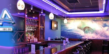 Brothers Nick and George Barakos, who own both Johnny’s and Kyma, basically gutted both the drab, pedestrian interior and the mediocre, family-restaurant menu of the Silk City Diner, leaving only the footprint of the former eatery. The result is a sleek, modern décor with upscale touches: neon blue and red strip lights lining the top edge of the main dining room, wave murals and a dynamic, wave-inspired logo, and lots of dark wood. The brightly-lit bar area is contrasted by more moderately lighted seating areas—booths and tables—accommodating about 160 patrons.